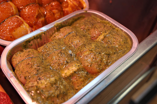 Grade A Chicken Breast wrapped in streaky bacon smothered in a garlic marinade