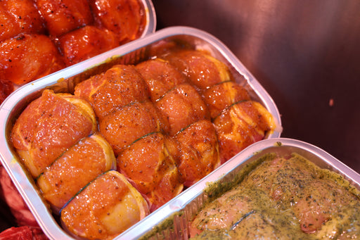 Grade A Chicken Breast stuffed with spicy brazilian sausage wrapped in streaky bacon smothered in a spicy chilli marinade